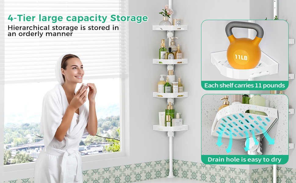 The shelves themselves have a central drain hole design so water doesn't pool under your bottles. Small detail, but your products will actually stay dry instead of sitting in a puddle. The material is described as stainless steel and coated metal, with plastic shelf trays. In real life, that means the pole feels solid and the shelves feel... adequate. Not flimsy, but not premium either.